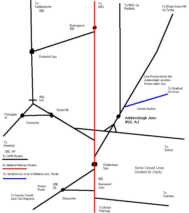 Addersleigh Junction was situated on an imaginary GWR route to South Birmingham, joining on to its line from Snow Hill to Lemmington Spa and Stratford-upon-Avon at Tysley. The GWR also built a line to serve as a direct route to Stratford. The Midland, whose route to Bristol via Lickey was expensive to operate with the need for banking engines, extended their route from Reddich to rejoin their original route at Cheltenham - Lansdown Road via Addersleigh Junc.